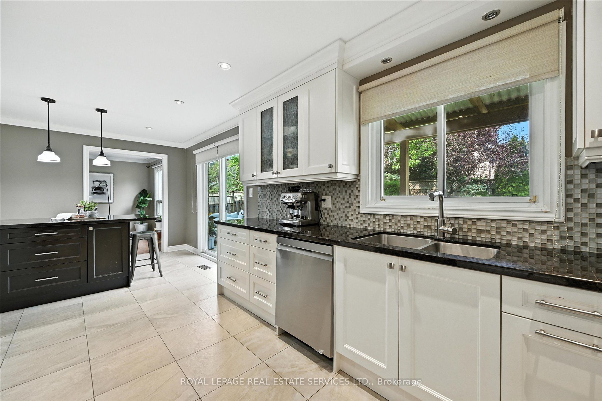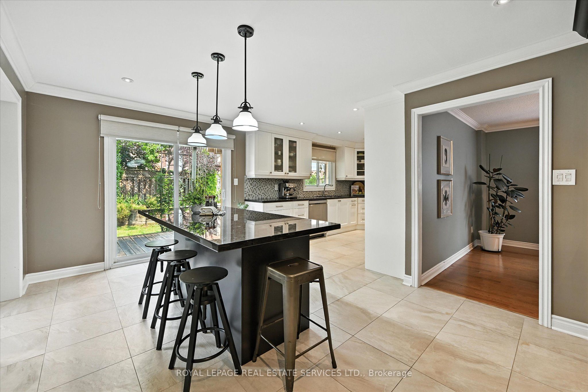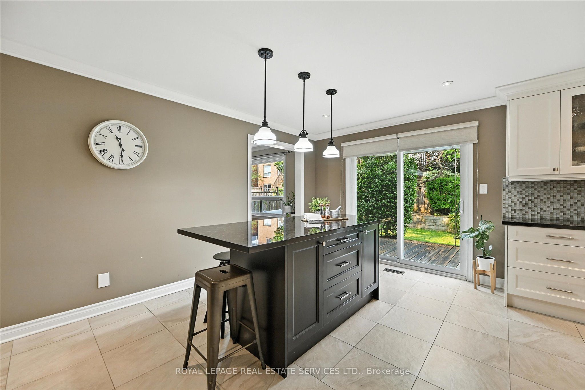 The beautifully renovated gourmet kitchen is a focal point, boasting white cabinetry, granite countertops, a designer backsplash, and a bright breakfast area with a built-in table and stylish storage wall unit. A convenient walkout leads to the backyard deck.