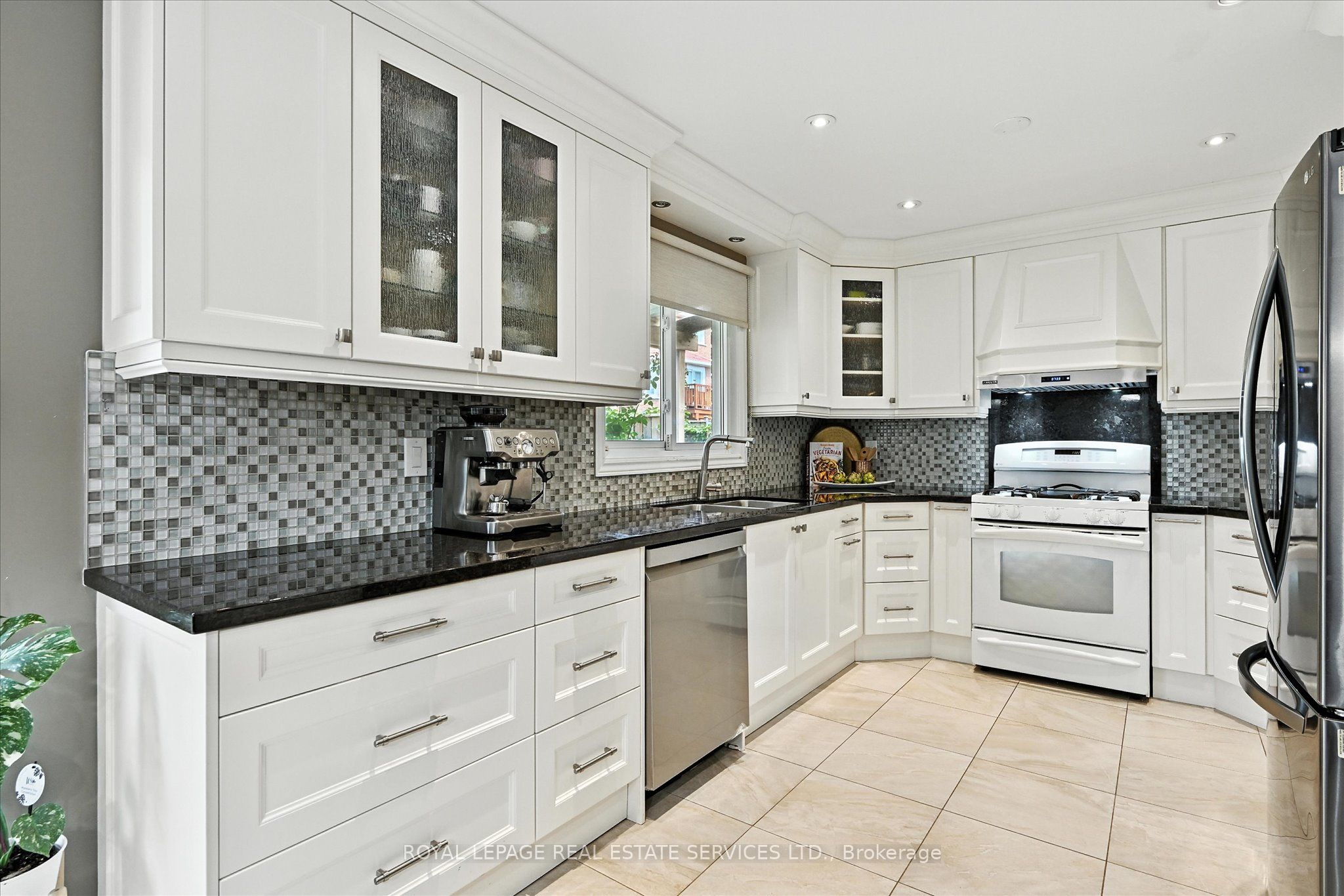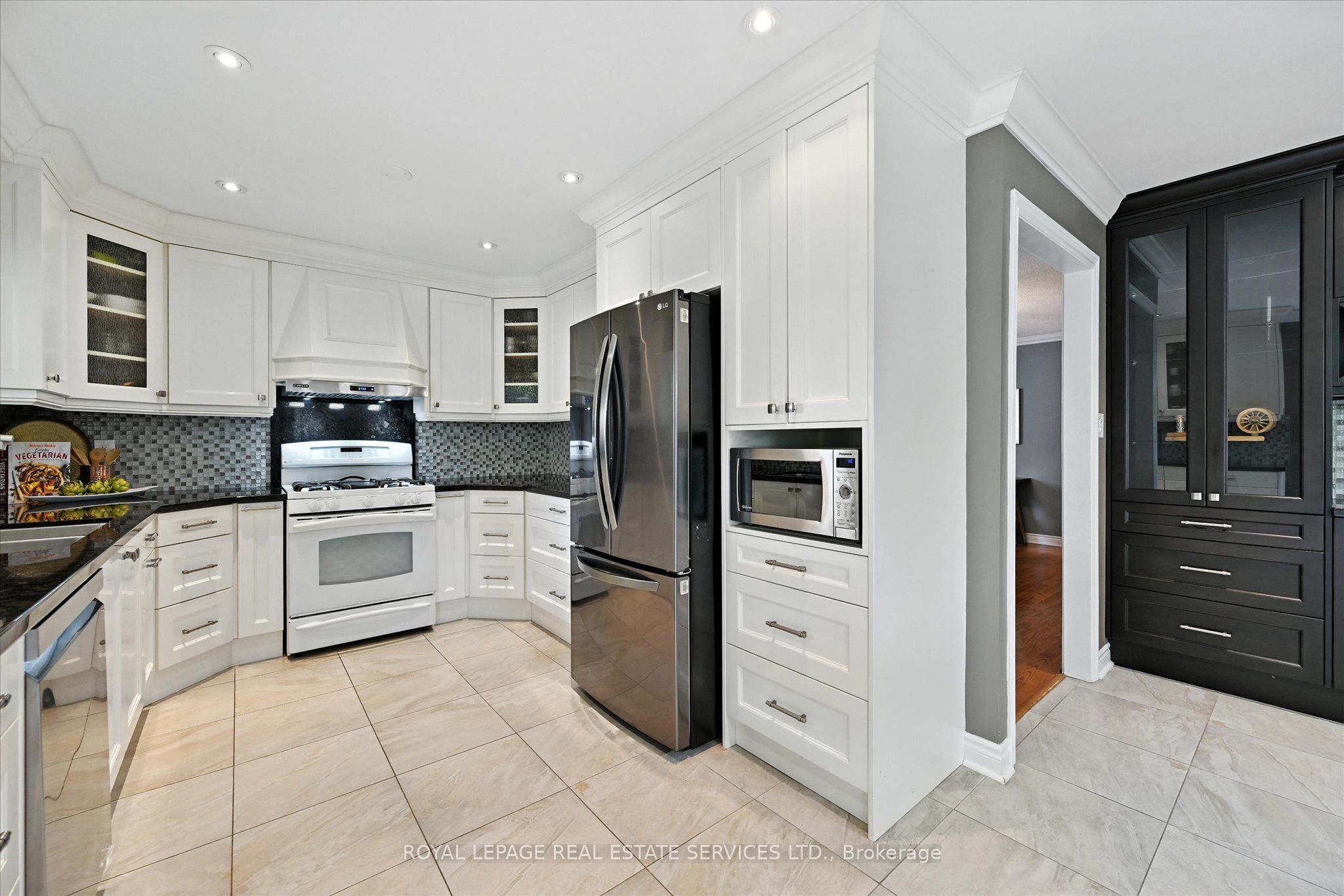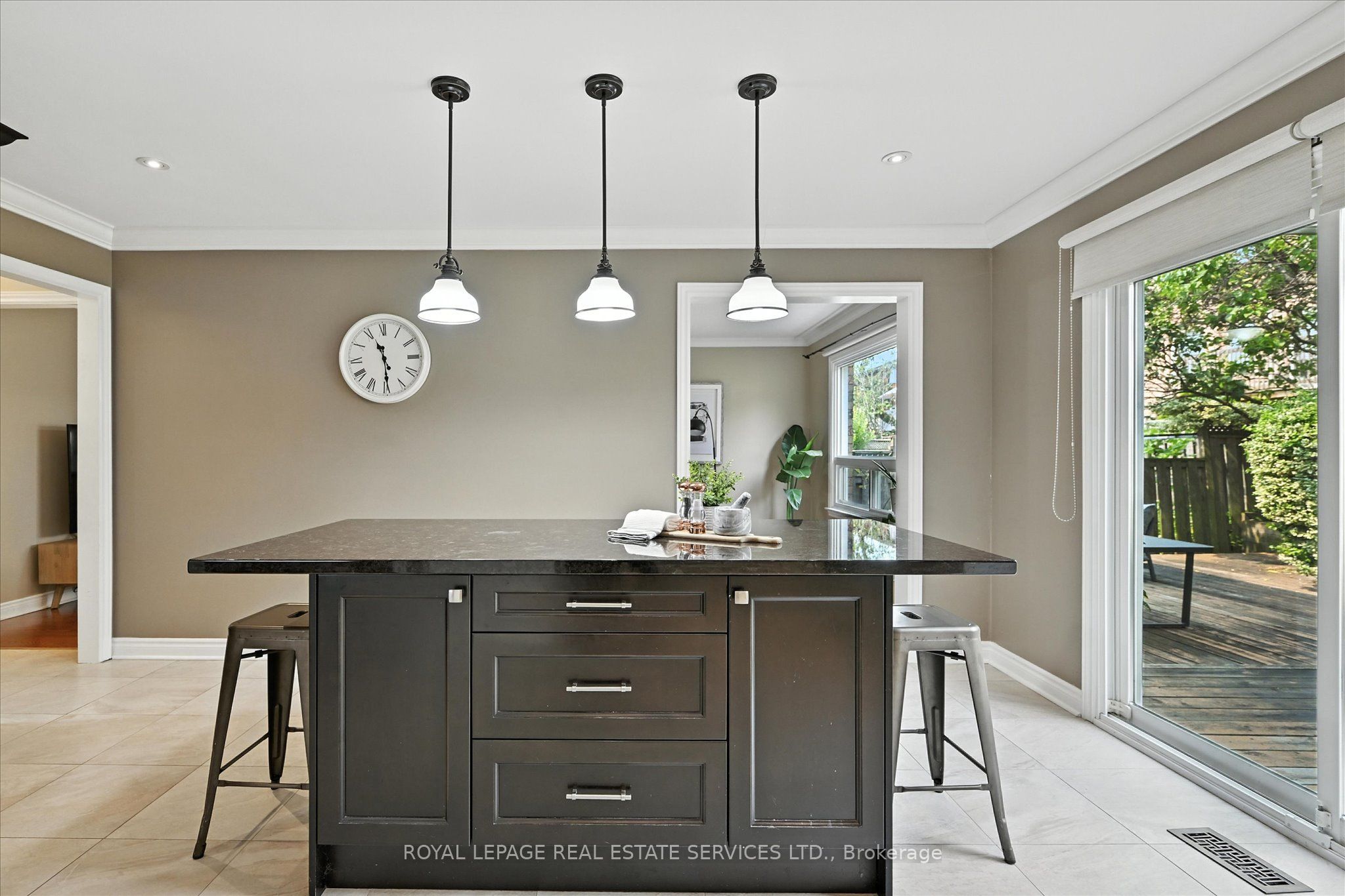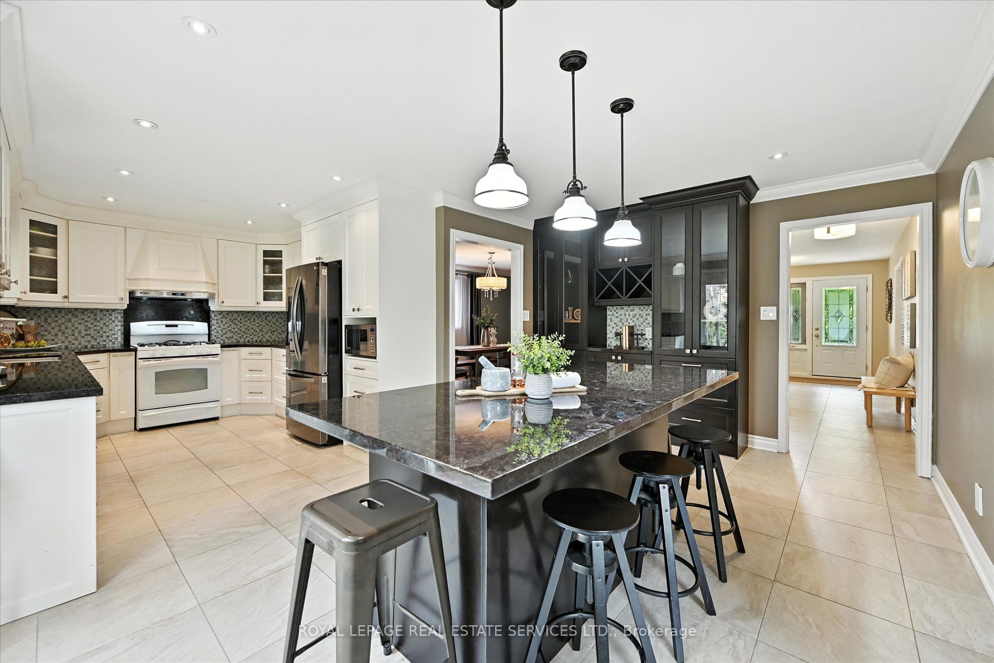 The beautifully renovated gourmet kitchen is a focal point, boasting white cabinetry, granite countertops, a designer backsplash, and a bright breakfast area with a built-in table and stylish storage wall unit. A convenient walkout leads to the backyard deck.